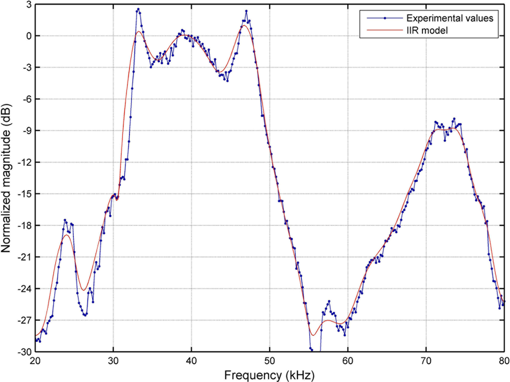 To model the first phenomenon, an accurate experimental analysis of the frequency response of the the emitter (driver + transducer) has been carried out in the range 20–80 kHz, obtaining the results shown in Figure 4 (blue dotted line). This response has been modeled with a 50 order IIR filter whose frequency response is also represented in Figure 4 with a red solid line. As can be seen in this figure, the actual −6 dB bandwidth experimentally measured with respect to the reference frequency of 40 kHz is about 16.5 kHz.