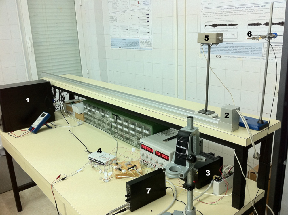 Electric slider: two meters long conveyor belt where the ultrasonic transducer is fixed. A rigid metallic platform has been built to separate the emitter from the base and avoid undesired echoes. This slider is capable to reach a maximum speed of 2 m/s, with maximum acceleration values of ±3 m/s2, thus providing an analysis window of about 800 ms of constant velocity.