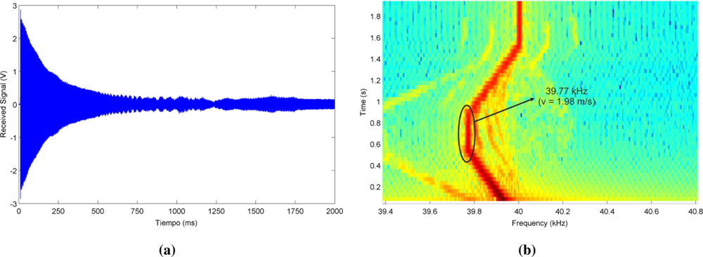Figure 8(a) shows the actual signal received by the microphone during this trajectory, and Figure 8(b) represents the spectrogram of this signal, where the Doppler shift associated to the different movements of the emitter can be clearly visualized. A detailed spectral analysis of the signal received during the second stage reveals a central frequency of 39.77 kHz, i.e., a Doppler shift of 0.23 kHz that corresponds to a emitter speed of 1.98 m/s if a sound speed of 343 m/s is considered.