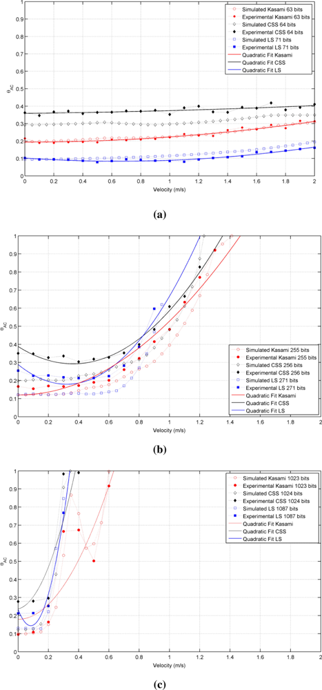 The experimental analysis has been carried out by increasing the emitter velocity from 0 to 2 m/s in steps of 0.1 m/s for all sequences and code lengths under consideration. During each trial, every code is emitted once when the platform has reached the constant velocity regime, and these trials are repeated ten times to provide average values of the auto- and cross-correlation bounds. Figure 9 shows the actual results obtained for the autocorrelation bound in all cases, together with the simulated results obtained in Section 3.3 for this range of velocities. As shown, there is a good agreement between both sets of data in all cases. The experimental values have been fitted to a second order polynomial in the form θAC(v) = A + B v + C v2, that is also represented in this figure as a continuous line. This quadratic fit, whose coefficients are presented in Table 3 for all sequences under analysis, is a useful tool to estimate the expected value of θAC for a particular sequence and a particular receiver speed.