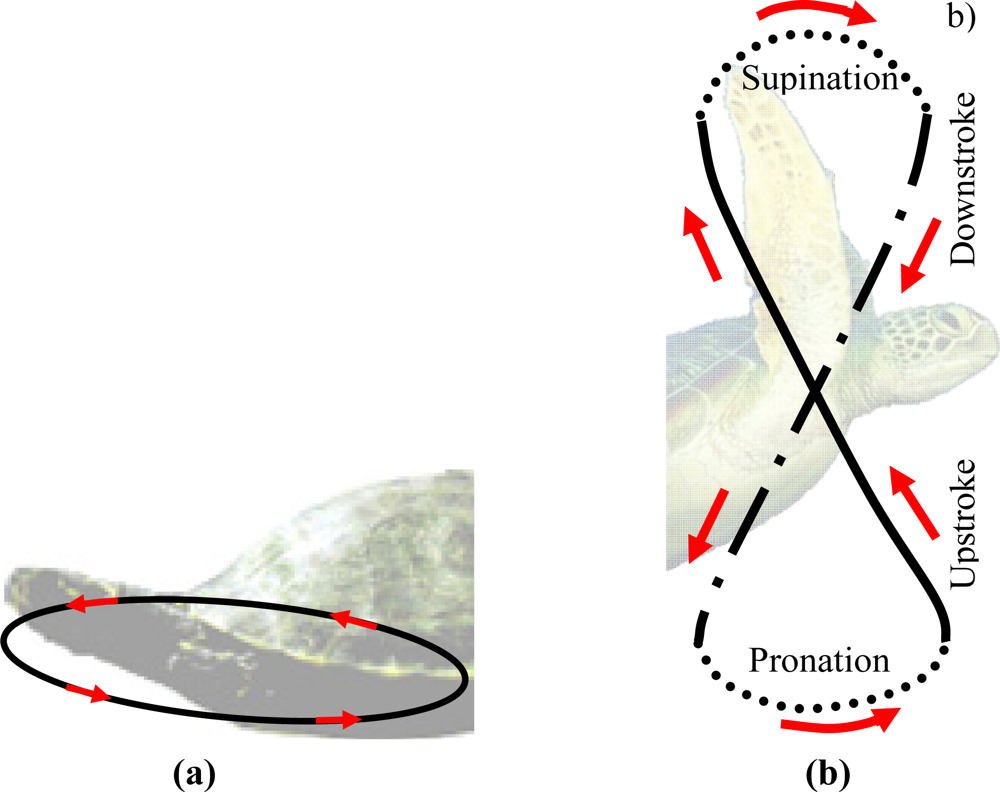 The turtle’s displacement is produced due to a thrust force generated on both lateral hydrofoils when performing a specific trajectory. Depending on the species of turtle, the trajectory of the hydrofoils changes []. Freshwater turtles’ locomotion depends on drag generating thrust by paddling, and each leg follows an oval-shaped trajectory [Figure 1(a)]. The trajectory of the hydrofoil of a sea turtle imitates a trajectory like a figure-of-eight [Figure 1(b)], and both drag and lift forces are involved []. In this case, the path followed by the hydrofoils is split into four different phases called downstroke, pronation, upstroke and supination [,]. The downstroke and upstroke phases are the most important, whereas pronation and supination are just phases to close the motion cycle with less resistance [].