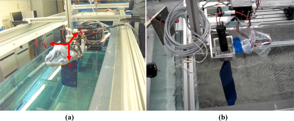 In this phase, three experiments were carried out in a water channel to validate the complete design. The propulsion system was fixed in the water channel by a dedicated structure. The main information extracted from the tests was the instantaneous current of each motor during the propulsion path and the average water speed at different points of the water channel. Figure 10(a) shows the reference axis system used in this work and Figure 10(b), an image obtained during the tests.