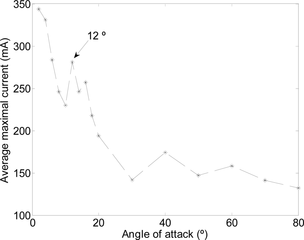 The path used was a linear motion where one motor (M1: Figure 6) was activated to generate the amplitude and another motor (M3: Figure 6) was used to define the angle of attack [(a) in Table 2]. Figure 11 depicts the total average maximum current for different angles of attack measured during the linear motion. On one hand, the results show that the total current increases as the angle of attack decreases (increasing the resistance of the water). On the other hand, the maximum water speed in the channel was obtained with an angle of attack of 12°.