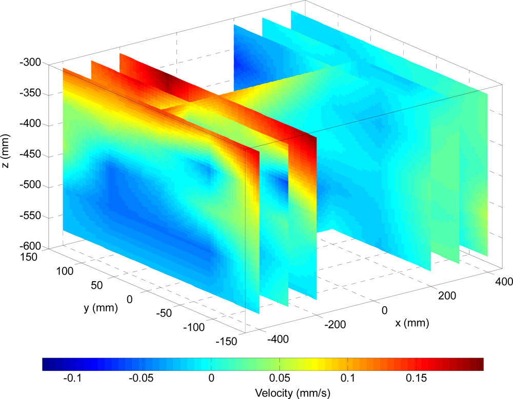 The last experiment consisted of the measuring the channel water speed (Figure 12) while applying the proposed optimal propulsion path to the hydrofoil (symmetric figure-of-eight path). The measurements points are specified relative to the (0,0,0) position which is defined at the center of the propulsion mechanism [see Figure 9(a)], the water level was at −200 mm in the z axis to simplify sealing the complete mechanism. The water speed was measured at the intersection of the mesh defined by the planes: [−400, −300, −200, 200, 300, 400] mm along the x axis, [−150, −75, 0, 75, 150] mm along the y axis, and [303.7, 370.4, 437.1, 503.8, 570.5] mm along the z axis [reference axes in Figure 9(a)]. To perform the measurements, the anemometer was introduced into the water channel together with a rigid structure to prevent the ripples created in the water by the force generated by the hydrofoil during motion from moving the sensor.