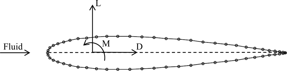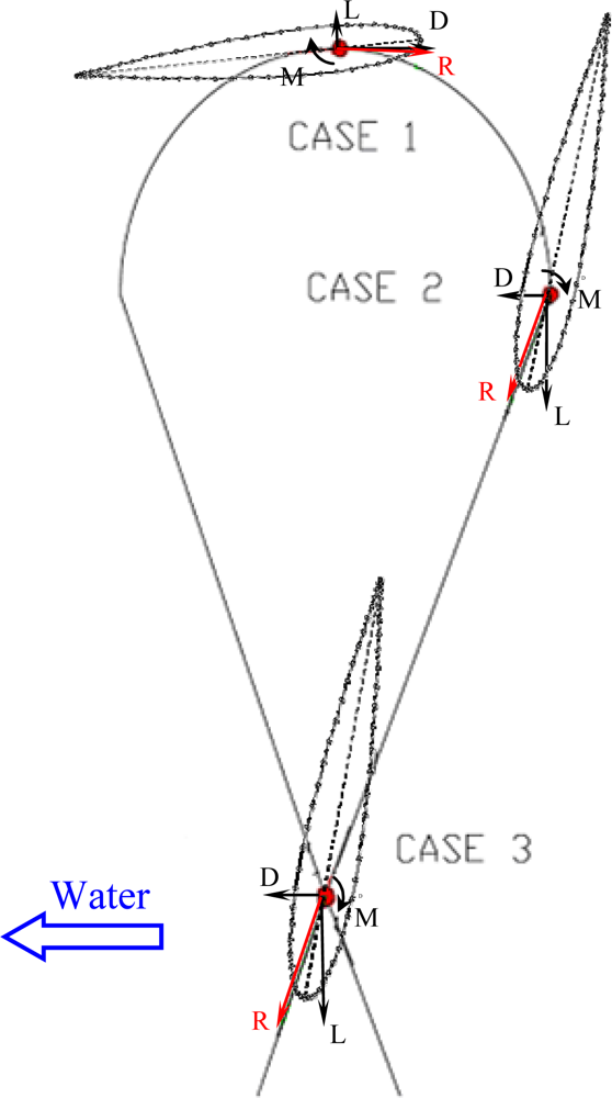 Each hydrodynamic profile in motion in a fluid is influenced by drag D and lift L forces, and the resulting moment M (Figure 2). Lift is defined as the sum of fluid dynamic forces perpendicular to the fluid direction whereas drag is the force that opposes the fluid direction but appears along that direction. All these forces are applied at the pivoting point which is located at 25% of the chord. Equation (1) shows the formulas to compute these forces, which depend on the geometry of the hydrodynamic profile and the characteristics of the fluid involved: