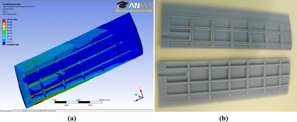 The design of the turtle hydrofoil was defined by the NACA 0014 profile using a characteristic linear dimension of 100 mm and a profile length of 307 mm, so the aspect ratio of the foil was 3.07. The functional prototype of the hydrofoil will be implemented using a rapid prototype technique in plastic FullCure 720 (tensile strength of 60.3 MPa, tensile modulus equal to 2.87 MPa, shore of 83 and density of 1.094/1.189) by splitting the fin into two parts that will match to become a unique element. The inner part of the hydrofoil was designed sparse to reduce its weight and the Ansys Workbench 11 program was used to verify that the hydrofoil has minimum weight and enough mechanical resistance to operate without a break down in the assembly. The best approach that satisfies both objectives was based on longitudinal strips located at distances of 58, 99.7, 141.4, 183.1, 224.8, 266.5 mm from the button of the fin (part used to attach the fin with the mechanism) and transversal strips located at 9.8, 37.1, 59.3, 71.9 mm from the right part of the fin. The width of the strips was 2.8 mm in both cases. Figure 4(a) shows the results of a von Mises stress simulation of the hydrofoil where the maximum value was 55 MPa, which is lower than the resistance of the material used. Figure 4(b) shows the rapid prototyping implementation of the design. These results confirm that the design will support all the mechanical effort performed without a break down in the assembly.