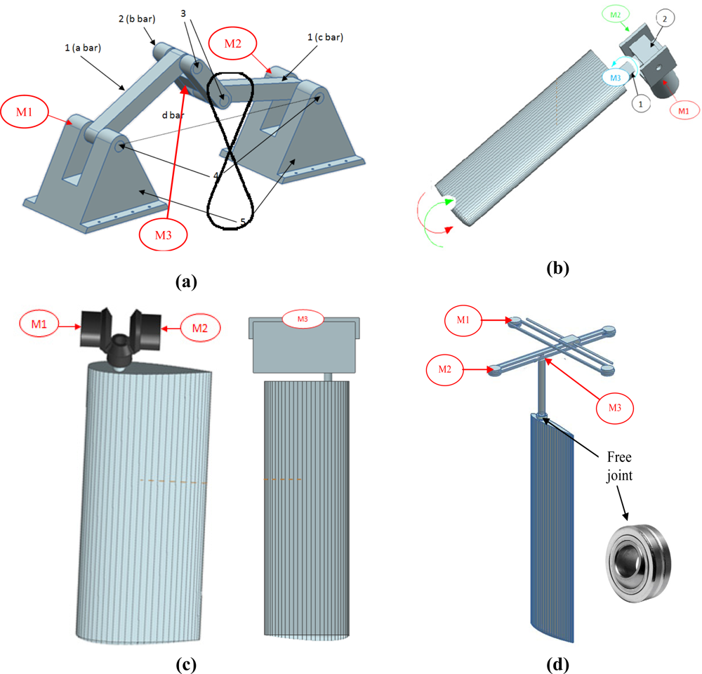 The 4-bar mechanism [Figure 5(a)] has two DoF and consists of four members represented by four bars controlled by two linked motors [M1 & M2: Figure 5(a)] located inside the fixed parts. The hydrofoil is attached to an additional motor placed in the middle point of the b bar to change the angle of attack [M3: Figure 5(a)]. The most important characteristic is that the middle point of the b bar describes a figure-of-eight trajectory (like the sea turtle). The amplitude of the path depends on the relations between the lengths of the members [Figure 5(a)]. The mechanism is characterized by four singular positions defined when the angle for the input and output bar is 45° and −45° with respect to the d bar. In these situations, the mechanism reaches a limit that makes the final motion uncertain. Therefore, in this case, the control of the angular orientation of the two linked motors must work properly to avoid a breakdown in the mechanism.
