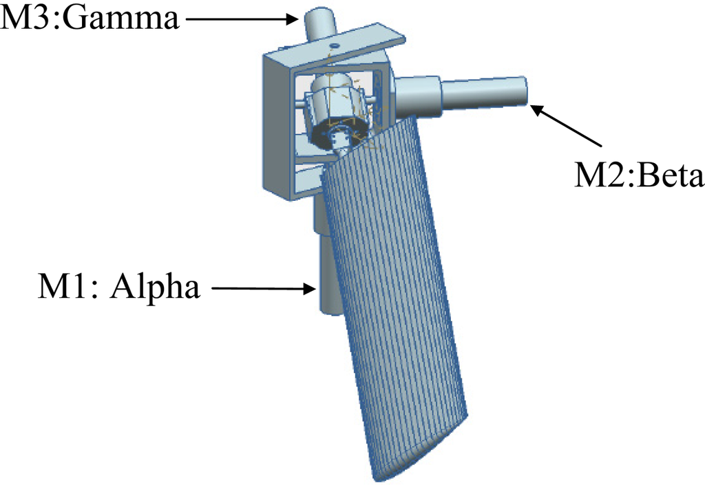 The ball-and-socket mechanism [Figure 5(b)] has three DoF provided by three motors located strategically in the mechanism and can apply any propulsion path to the turtle hydrofoil. In this case, the horizontal motion is generated by controlling motor M1, motor M2 controls the vertical motion, and M3 is used to control the hydrofoil angle of attack. This design is very compact and can easily be integrated into the structure of an AUV. In this case, the control of the three motors is simple but the generation of the sequence of angular orientations required to generate a figure-of-eight shape trajectory is complex and may require verification with a simulation tool.