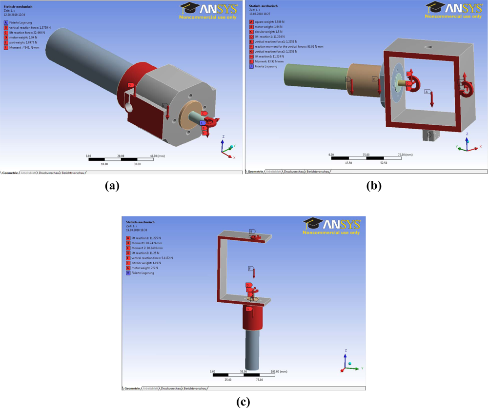 Some considerations were made to compute the static mechanical analysis. A rigid solid was created when there was no relative motion between the parts involved, so a simulation study was carried out applying the forces as a unique element. For this, the mechanism was split into three assemblies [Figure 7(a–c)] and the turtle hydrofoil. The first assembly to be studied must be the turtle hydrofoil since is where the most unfavorable hydrodynamic forces were applied and had effects on the other components of the mechanism. Another assumption made was that the hydrodynamic forces were applied to the tip of the hydrofoil.