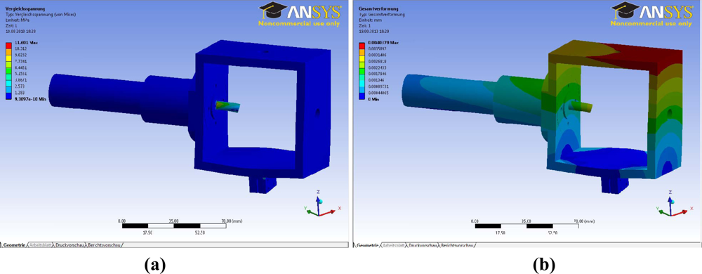 To ensure that each component will be strong enough to withstand the forces, the maximum von Mises stress results of the simulations have to be higher than the yield stress of the material used to manufacture the part. In addition, the deformations have to be within a limited range to verify that the part will work properly. Figure 8 shows the results of both analyses for one of the assemblies of the mechanism.