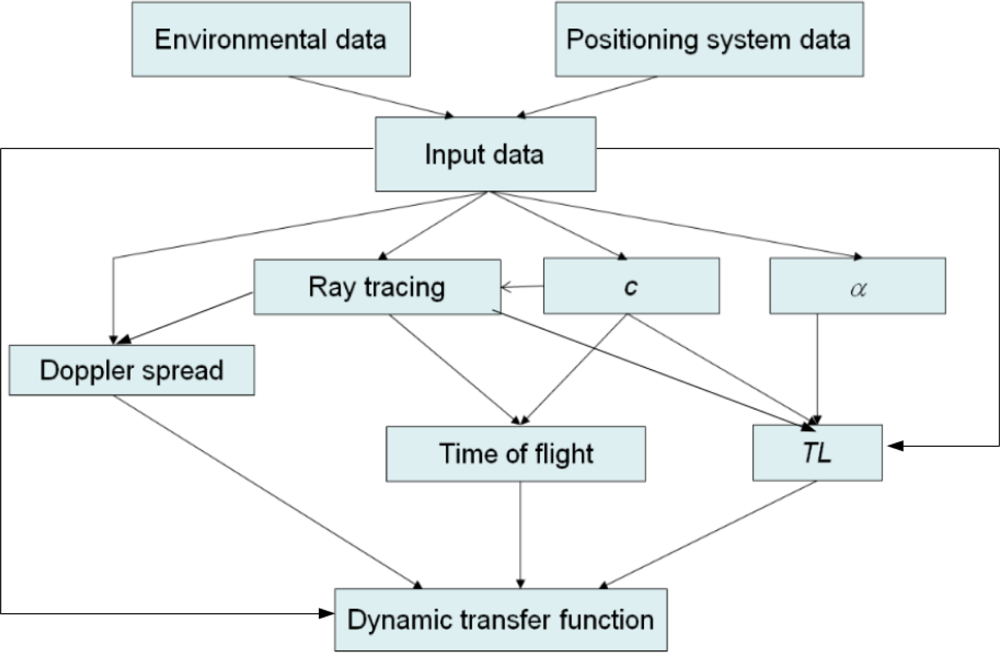 The block diagram of the model is shown in Figure 1. The inputs are environmental parameters, such as temperature, depth, salinity, bottom and water densities, wind speed or sound speed at bottom material; and the positioning system parameters, such as signal frequency, hydrophones’ depth, the aperture angle of the transducer or the position of the buoys. With all these data, the sound speed can be computed, as well as the absorption coefficient, α. Knowing the sound speed profile, the model performs a ray tracing in the considered environment, and computes the Doppler spread. With the information from the ray tracing and knowing the sound speed profile, the times of flight from the different arrivals are obtained, whereas the transmission loss (TL) is computed knowing the absorption coefficient, sound speed in water and in bottom material and using information from the ray tracing, such us the distance traveled by the rays, as well as some of the inputs of the model, like wind speed or signal frequency. The dynamic transfer function is then obtained using the internal Matlab function rayleighchan, which need as inputs the times of arrival for the different eigenrays as well as their transmission loss, the sampling frequency and the Doppler spread.