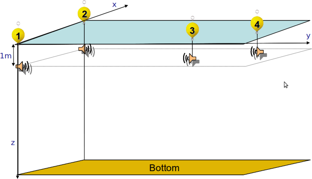 At 1 m depth in each buoy there is a hydrophone, acting both as an emitter and receiver. The signal emitted by these hydrophones is supposed to be omnidirectional in the horizontal plane, but limited between ±20° in the vertical plane. Figure 2 shows the positioning system configuration.