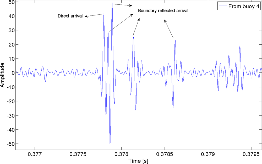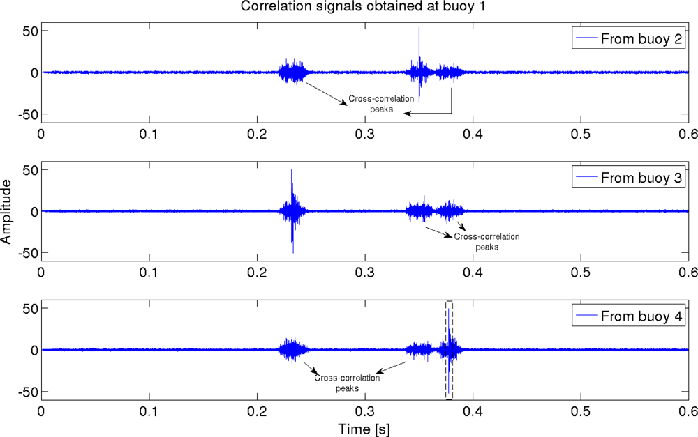 At each buoy, the received signal consists of the signals coming from the other three, which have suffered a fading obtained with the propagation model. Every buoy correlates this received signal with the CSS codes of the other three buoys, obtaining several correlation peaks, as can be seen in Figure 3, that shows an example for the signal received at buoy 1. Cross-correlation peaks have been marked in the figure, whereas Figure 4 shows a zoom of the autocorrelation peaks with the code from buoy 4. Several peaks can be detected, the first one coming from the direct arrival, and the other ones are boundary reflected paths. One of them has higher amplitude than the direct path, due to the particular phase interference. This is one of the sources of error in the measurement of the times of flight.