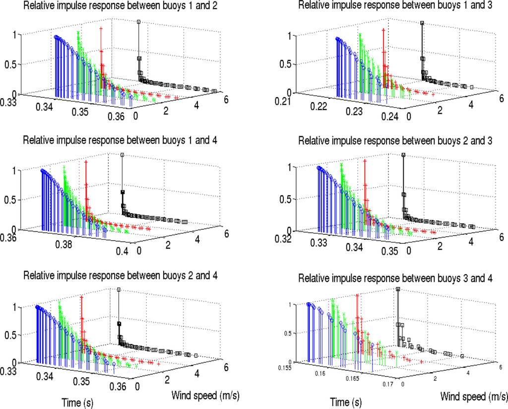 In this work, the SNR is defined as Eb/N0, where Eb is the energy per bit and N0 is the noise power spectral density, assuming an additive white Gaussian noise. The SNR values used were 12, 0 and −6 dB, obtaining three different situations with a strong signal in the first case, a noticeable noise in the second one and a very unfavorable situation in the third one. For the wind speed, four values were used: 0.5, 2, 3.5 and 6 ms−1, considering different situations ranging from almost no wind to a remarkable wind speed between them, where these values are easily found in Comodoro Rivadavia. The effect of the wind in the impulse response and the time spread can be seen in Figure 5, where the responses defined by each pair of buoys have been represented. Interference is expected between the signals of different buoys, as a severe multipath is present when there is almost no wind speed.