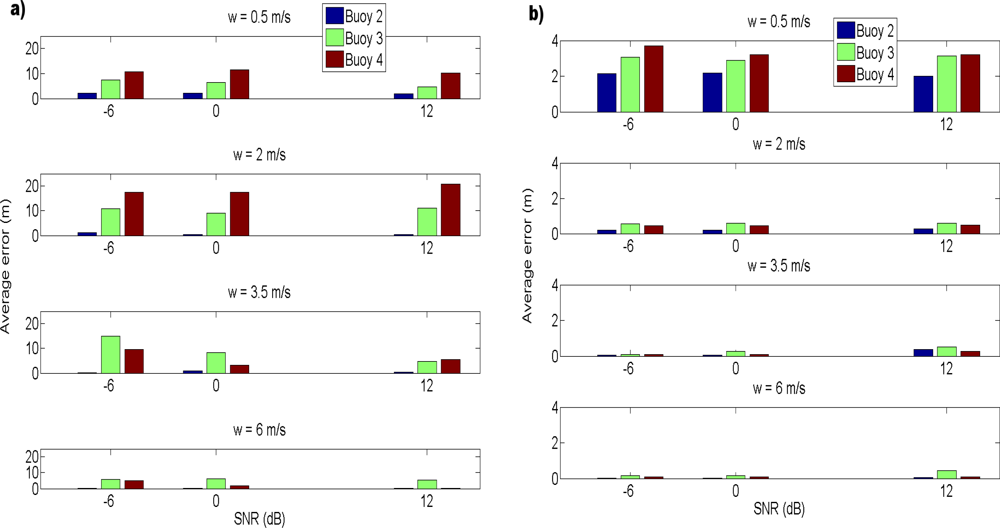 The results for the average error in each buoy, considering different values of SNR and wind speed are shown in Figure 6, where the values for the first buoy are not given, as this buoy is the origin and it is always considered fixed at (0, 0) m. In order to avoid the late arrivals due to multipath, as well as the detection of a maximum from another signal due to the near-far effect, a threshold of 10 m has been considered. Errors greater than 10 m has been identified as outliers and removed, after checking the histograms to verify that most of the errors were below 10 m. Figure 6(a) shows the results for all the simulations, whereas in Figure 6(b) the outliers have been taken out. Note the different scales used in the Y axes of Figure 6(a,b).