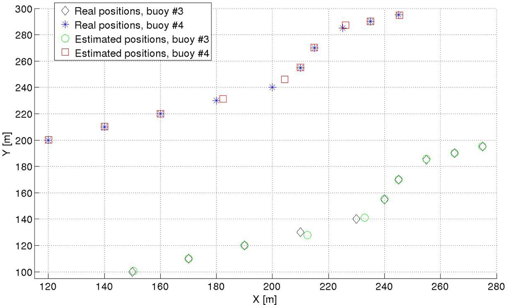For this simulated example, the buoys are supposed to be perfectly synchronized, e.g., by a RF link. As the errors in the system are in the order of a meter, as it is shown in Section 4, the system will be robust to synchronization errors up to approximately two hundred microseconds. These synchronization errors would cause a positioning error of the order of few decimeters. This tolerable synchronization error is greater than those found on the literature [,] for RF synchronization. An emission every three minutes is considered.