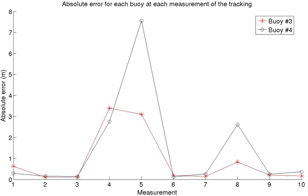 Both the SNR and the wind speed can vary from one position to the next one, as well as the value and direction of the surface current, to represent a realistic as possible situation. The fixed buoys were placed at (0, 0) m and (0, 300) m, and the moving buoys were placed initially at (150, 100) m and (120, 200) m. The results of the tracking can be seen at Figure 7, whereas Figure 8 shows the absolute error for each position and each buoy. The values for the SNR, wind speed w, and surface current for each measure are given in Table 2.