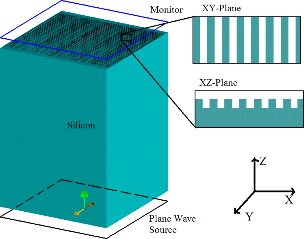 Lumerical’s FDTD solution software was used to numerically simulate our grating structure. The gratings were constructed on a 425 μm thick silicon slab with periodicity of 630 nm, groove width and height of 300 and 400 nm, respectively. In order to avoid huge computations due to the dimensions of these devices, the FDTD method was used with periodic boundary conditions in the X, Y directions. We implemented a full 3-D FDTD simulation based on square non-uniform mesh since a major part of this device is a silicon substrate with shallow gratings on its surface. Based on this technique, the default grid size used to mesh the structure was set at 18 nm with a finer 10 nm mesh over the gratings pattern region. In this way, the accuracy and convergence of the simulations are both guaranteed, while the computational resource requirements are reasonable enough to run the simulation. The light source was placed at the bottom of the silicon slab and normal transmission was recorded at the top of the gratings. Figure 1 shows the simulation model built with the Lumerical FDTD simulation software.