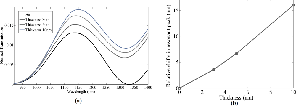Once the bare grating structure was successfully simulated, a thin film of material with refractive index 1.502 was simulated on top of the gratings with different thicknesses ranging from 3 to 10 nm. The material was set to have same optical properties as the biochemicals used in the experiment. Grating structures with different bio-material thickness were simulated to estimate the shifts in resonant peak wavelength. Normal transmission spectra for thickness of 3–10 nm of bio-material on top of the gratings were simulated. As seen in Figure 2(b), the resonant peak wavelength red shifts as the thickness of the bio-material increases. When the estimated thickness of the bio-material layer was ≈10 nm, the resonant peak wavelength shift in the simulated data was observed to be 16 nm, with a sensitivity of 1.60 nm per nanometer of thickness change of bio-material of refractive index 1.502 on the grating surface, which is higher compared to photonic crystal micro-cavity bio-sensors [15]. Zhiyong Wang et al. have reported similar sensitivity for optical fiber gratings, but for detecting a higher refractive index material [9].