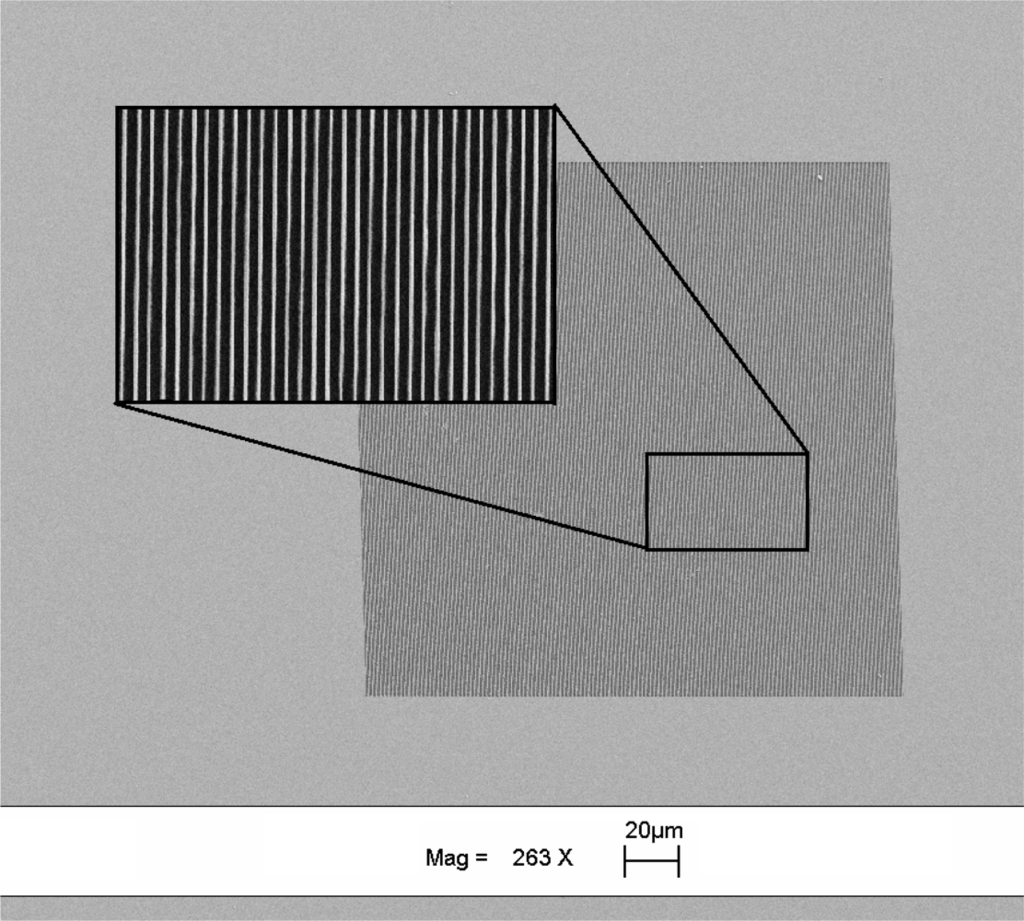 The gratings were fabricated on a double side polished silicon wafer of 425 μm thickness. The grating pattern was written on ZEP-520a resist on a silicon substrate using e-beam lithography. The samples were developed in ZED-N50 and the silicon was etched using a deep silicon plasma etcher with an etch rate of 12.5 nm/s for 32 s. After successful etching, the samples were cleaned in an oxygen plasma asher to remove hydrocarbon contaminants and any resist remaining during fabrication and gratings depth was measured to be ∼400 nm. The dimensions of the fabricated gratings were chosen to be 200 × 200 μm (length × width) and the period of the grating was fixed at 630 nm. Figure 3 shows the SEM image of the gratings fabricated on double sided polished silicon wafer.