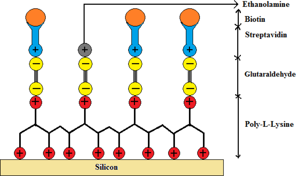 The immobilization technique used in this work was adapted from a previously published process on photonic crystal fibers for labeled antibody detection [18]. In our experiment the immobilization technique was modified with biotin as a target molecule instead of antibodies to make it a label free sensor. Prior to immobilizing the streptavidin on gratings, a biochemical coating of poly-l-lysine and glutaraldehyde is deposited to ensure trapping of the streptavidin on the gratings. Between each step of the coating procedure, the gratings were rinsed in a pH neutral solution of Phosphate Buffered Saline (PBS, 10 mmol) for 5 min. The first layer was deposited on silicon by immersing the samples in an aqueous solution of poly-l-lysine (1:100 in H2O) acting as a positively charged substrate for 15 min, covered then by a negatively charged layer of glutaraldehyde (12.5%) for 45 min which then binds to the poly-l-lysine. The samples were then left in streptavidin (0.016 μmol/mL in PBS of neutral pH) for 30 min to bind to the glutaraldehyde sites. Finally, the empty sites of glutaraldehyde were blocked by positively charged ethanolamine molecules (40 mmol) by keeping the samples immersed for 20 min. A schematic of the biochemical layers holding the streptavidin and biotin is shown in Figure 4. A subsequent PBS washing eliminated the unspecific bindings and addition of ethanolamine molecules covered up the unbounded sites of glutaraldehyde preventing any unspecific binding. Streptavidin is a protein with an exceptionally high binding constant of 1015 M−1 with biotin. The biotin-streptavidin system serves as the bio-conjugate pair in this demonstration. Once the streptavidin was functionalized on to the silicon substrate, the samples were covered with biotin (12.27 μmol/mL in PBS of neutral pH) for 30 min and samples were rinsed with PBS solution to remove any unbound biotin from the silicon surface.