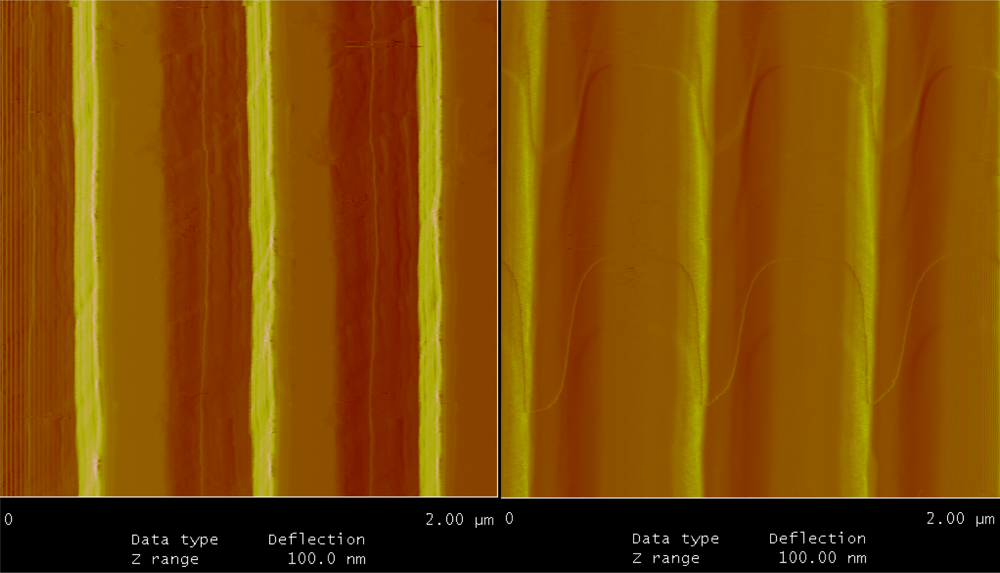 The uniformity, thickness of bio-material on the grating surface were characterized using AFM imaging and ellipsometry. Figure 5 shows the AFM images of the bare silicon gratings and after biotin immobilization on the grating surface. The samples are uniformly covered with the bio-material and uniformity of this layer was measured to be ±0.48 nm on the total bio-material layer thickness of 9.25 nm. The left image in Figure 5 shows the sharp edges of the silicon grating whereas the image on the right shows the biochemical layer with streptavidin and biotin uniformly covering the inner walls and the top surface of the gratings. Ellipsometry was used to measure the thickness of the biochemical layer along with streptavidin and biotin. In addition to thickness measurements, ellipsometry was also used to measure the refractive index of the layers coated on silicon surface. The thickness of the biochemical layer along with streptavidin and biotin was measured to be 9.25 ± 0.25 nm and the refractive index was found to be 1.502 at 1,137 nm. Ellipsometry measurements were done on bare silicon as a grating pattern can interact with the polarized light used for thickness measurements and refractive index measurement. AFM shows conformal coverage and hence ellipsometry on bare silicon should yield accurate results.