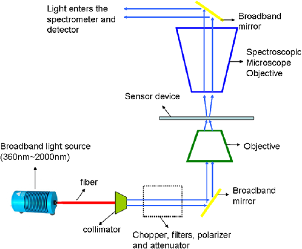 Normal transmission measurements were performed on the gratings using 0.8 m high resolution spectrograph and InGaAs detector. As shown in Figure 6, the measurement setup consists of broadband light source from 360–2,000 nm which was passed through a collimator. The collimated beam was then passed through a series of optical components such as chopper, filters, polarizer and attenuator. Polarized light was then focused using an objective onto the sample. Transmitted light from the sample was collected by a spectroscopic microscope objective and then directed into the spectrometer and detector.