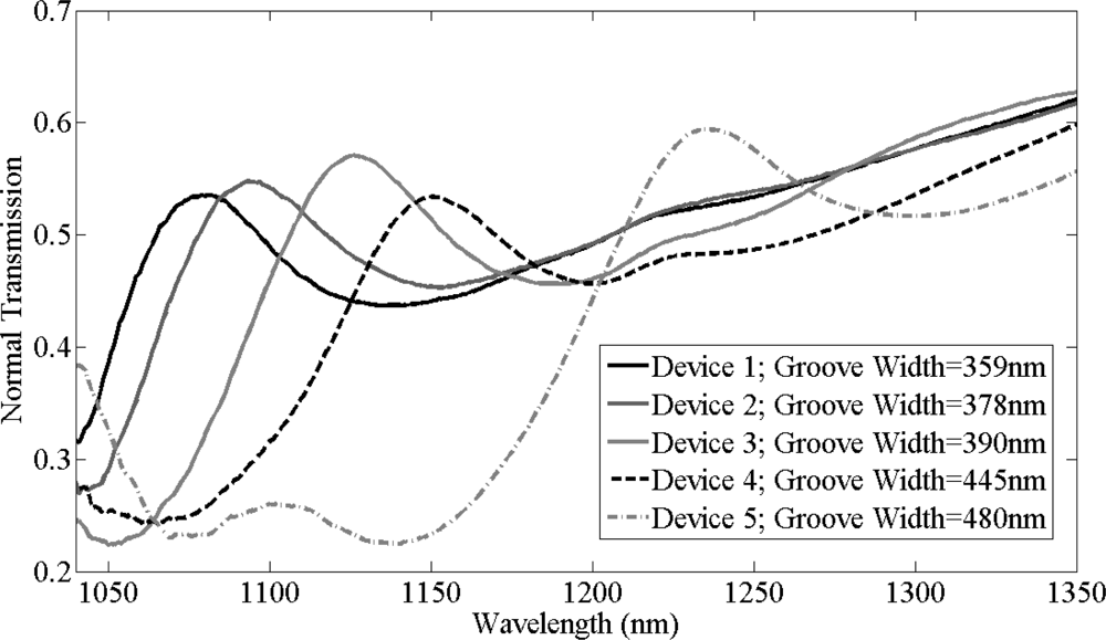 Gratings with different groove width were fabricated by varying the e-beam dose. The groove widths of silicon gratings were later measured accurately using an AFM and found to vary from 359 to 480 nm. Normal transmission through the gratings with different groove widths are expected to have resonant peaks at different wavelengths as the gratings resonant peak is highly sensitive to the grating width, grating depth and periodicity [16,17].