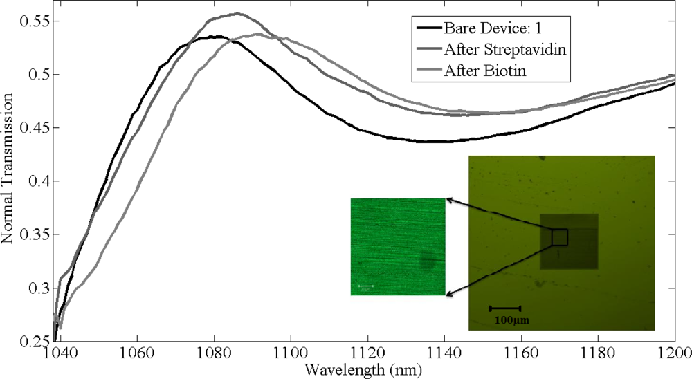 The thickness of chemical layer of after coating poly-l-lysine and glutaraldehyde was found to be approximately half a nanometer with refractive index 1.35 and the transmission shift produced in normal peak of gratings is negligible. The thickness of the bio-material layer after immobilizing streptavidin on the silicon gratings is expected to be around 5 nm. After functionalizing streptavidin on the gratings surface, measurements were recorded and a shift of 7 ± 1 nm was observed in the resonant peak in all the gratings. Final measurements were recorded after biotin binding to streptavidin. Dev(1,2,5) were washed with PBS solution to remove the unbounded biotin where as dev(3,4) are unwashed samples. Figure 8 shows the shifts in the resonant peaks of the normal transmission spectra due to streptavidin and biotin binding in device 1, with the inset showing the confocal image of the device after functionalization with biotin. Streptavidin was tagged with fluorescein with fluorescence signal at 514 nm confirms the presence of streptavidin binding on silicon grating surface.