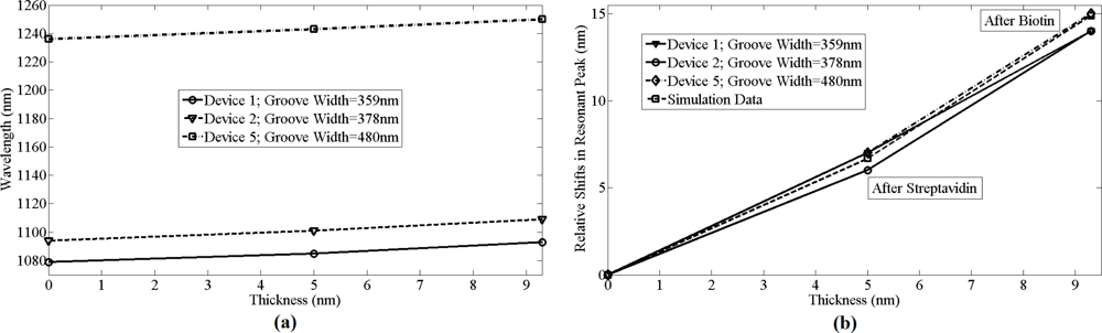 For dev(1,2,5), shifts of 8 ± 1 nm in resonant peak wavelength were observed due to specific binding of biotin to streptavidin, as shown in Figure 9. In comparison, for dev(3,4) shifts of 110 nm and 95 nm in resonant peak wavelength was observed, respectively, due to the physical adsorption of biotin along with biotin that was bonded to streptavidin. There is a difference of 1 nm in shifts among dev(1,2,5) after functionalizing with biotin as the immobilized layer after biotin varied by ±0.25 nm for these devices. Figure 9(a) shows the absolute shifts in wavelength with increasing groove width as well as wavelength response of dev(1,2,5) to streptavidin and biotin binding, while Figure 8(b) shows the relative shifts in resonant peak wavelength due to streptavidin and biotin functionalization on the grating surface. Though the streptavidin is bigger in size compared to biotin, due to the concentration difference between streptavidin and biotin, more binding sites for biotin on streptavidin are available and also one of the important factors is the refractive index of each bio-material layer, which produces the resonant peak shift. It is not possible to measure the refractive index of each and every layer individually. The measured refractive index of 1.502 is the effective refractive index after immobilizing streptavidin and biotin. It was observed from Figure 9(a,b) that the device resonant peak wavelength response to streptavidin and biotin binding remains constant and independent of original groove width differences. The simulation prediction matches closely with the measurement data and the immobilization technique in this experiment was designed so as to functionalize monolayers of streptavidin and biotin to have a better control of the thickness and distribution of streptavidin and biotin on the silicon surface. We used 12.27 μmol/mL of biotin for 0.016 μmol/mL of streptavidin for our experiment and sensitivity of 1.61 nm per a nanometer of thickness change of bio-material on the surface of silicon gratings was measured. This is a large concentration and there is probably still some non-uniformity as they are coated on the gratings and the optical measurement is averaged over a larger area. So while the spectral shifts are confirmed repeatedly, the exact thickness of the added layer has some uncertainty (also due to refractive index changes mentioned earlier). Further measurements with different concentrations have to be investigated.