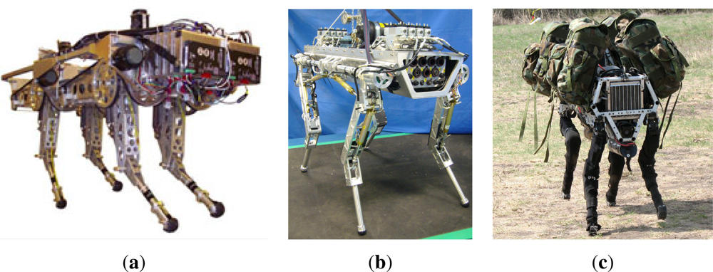 Biological quadrupeds transition from walking to running gaits at a dimensionless speed between 0.54 to 0.7. Concretely, horses transition from walk to trot at û = 0.59 [21]. As exceeding this dimensionless speed requires the quadruped to run (trot or gallop) and some complex terrains could impede the use of those high-speed gaits, we have considered the dimensionless speed of 0.54 as the lower speed limit for a legged robot to be considered agile. By having a look to Table 1 it is noticed that very few quadrupeds achieve agile locomotion performance, because those robots featuring dimensionless speed above 0.54 have almost negligible payload-to-weight ratio. Although some research labs are working in this direction (Stanford University [22], Italian Institute of Technology [23]), the only existing robot reaching those targets is BigDog [4], a quadruped under development at Boston Dynamics (USA) (see Figure 1). The BigDog project is sponsored by DARPA, the US Marine Corps and the US Army. The goal of the BigDog Project is to build a class of agile unmanned ground vehicles with rough-terrain mobility superior to existing wheeled and tracked vehicles. The BigDog robots currently built “have taken the steps toward these goals, though there remains significant work to be done” [4]. Unfortunately, the ins and outs of the technology underlying BigDog are not available to the research community.