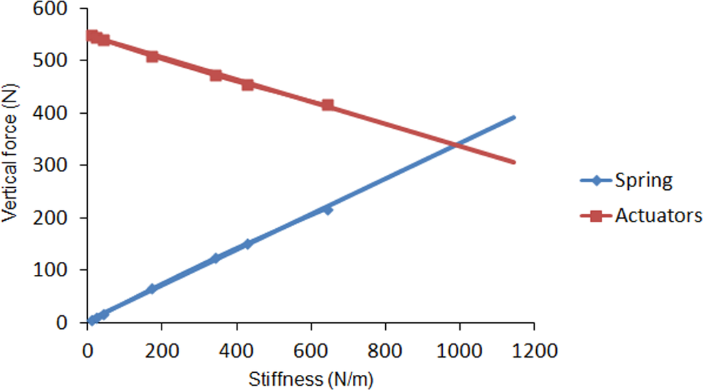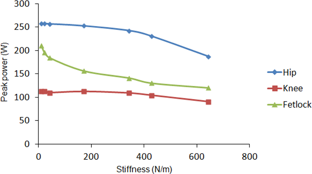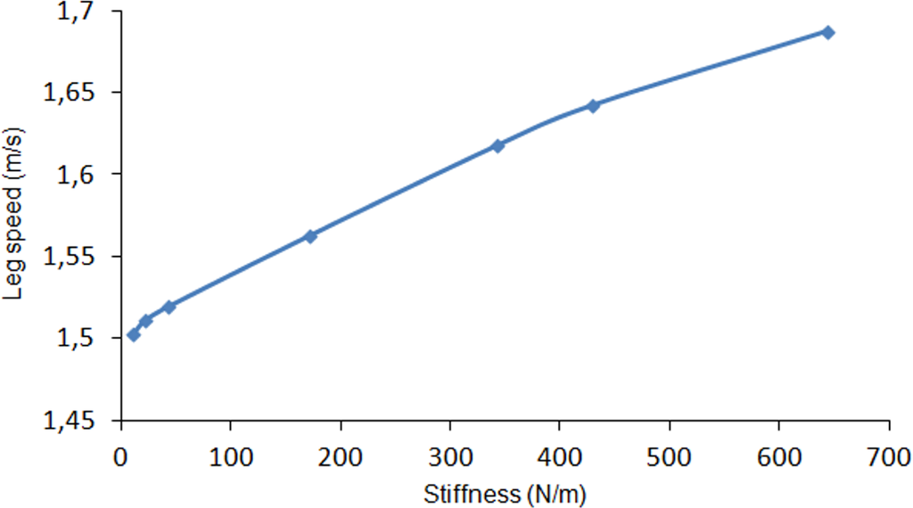 In order to analyze the energetic advantage of introducing elastic energy recovery in the robot leg, a spring has been attached to the simulated leg from hip to fetlock joint. The leg motion is again commanded at an average leg speed of 1.5 m/s. The spring stiffness is increased in each cycle. Figure 8 shows the effect of increasing spring stiffness on the vertical propulsion force exerted by the actuators on the leg’s base reference frame. Although simulations were performed for spring stiffness varying up to 650 N/m, a linear tendency line has been plotted in order to show the behavior for larger stiffness. As it can be observed, as long as the spring stiffness increases, the vertical force exerted by the spring increases, what results in a lower force demand provided by the actuators. The tendency lines cross at a spring stiffness of 980 N/m and for larger stiffness the propulsion force exerted by the spring exceeds the propulsion force required by the actuators. Figure 9 shows how the peak power requirement at each joint diminishes as the spring stiffness increases. It also shows a larger dependency on spring stiffness at hip and fetlock, while the knee power shows a minor variation. For the maximum simulated spring stiffness of 650 N/m a 31% of power is reduced due to the elastic energy recovery. However, it is worthwhile noting that the spring stiffness should not be increased too much, because a too large stiffness would dominate the leg dynamics, neglecting the action of the actuators thus yielding a pure spring-mass system without possibility of adaptation to the environment. The effect of leg elasticity on leg speed is shown in Figure 10. In this figure it can be observed that, although a leg speed of 1.5 m/s is commanded, the increase in leg stiffness produces a progressive rise in leg speed by reducing the support time.