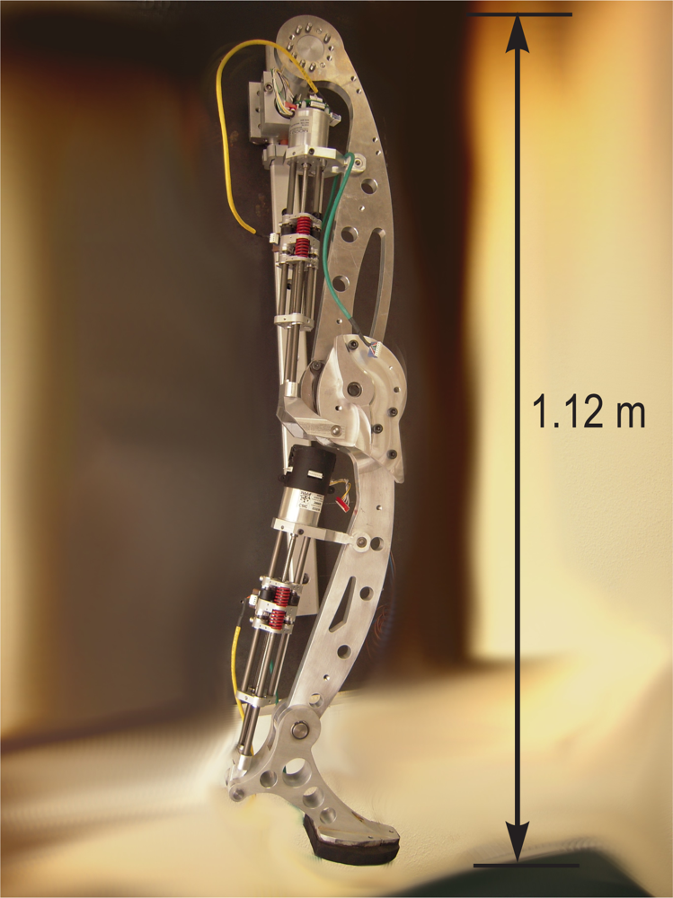 However, this paper has shown that it is not only a matter of extracting the key principles of agile locomotion from nature. In fact, the success of the development of efficient biomimetic prototypes strongly depends on the improvement of technological key factors that currently limit the performance of biomimetic designs. In this paper, a real prototype of a biomimetic leg has been presented. Difficulties in engineering the biomimetic key principles conducted to a final prototype not able to achieve the final goals for agile locomotion: robot’s nondimensional speed over 0.54 and payload to weight ratio between 1 and 1.5. Although the payload capacity has been tested, the leg was not able to walk faster than 0.54 m/s, which results in a non-dimensional speed of 0.2, almost three times lower than the initial goal. The cause of this failure is mainly the use of a structural material that did not meet the initial specifications, or the need for actuators featuring larger power-to-weight and power-to-volume ratios.