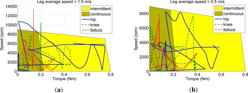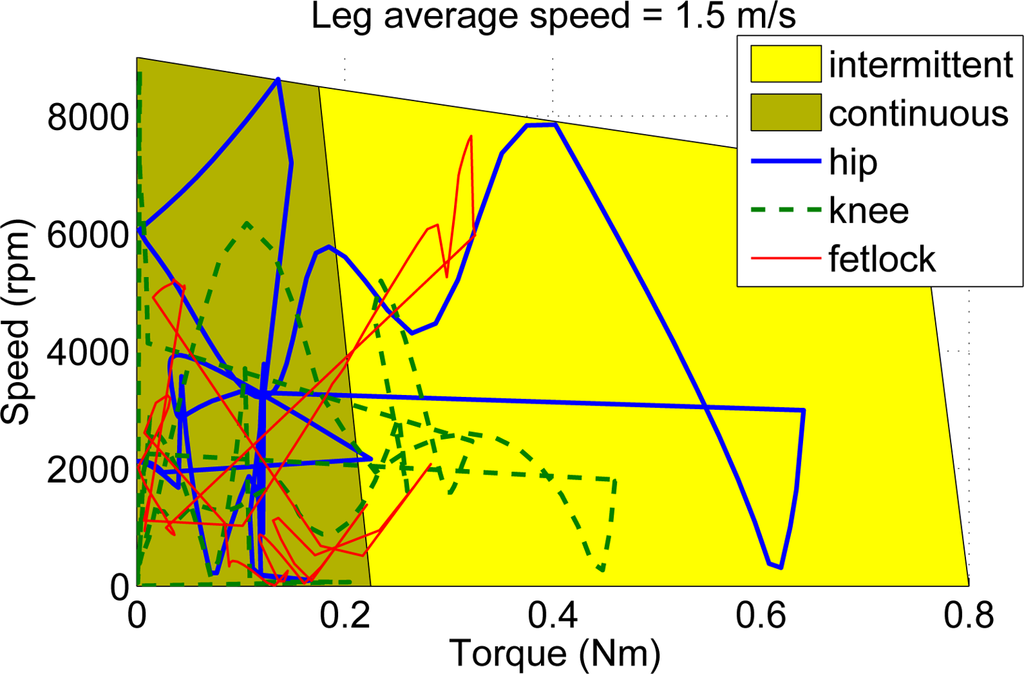 In order to analyze the suitability of commercially available actuators for the power requirements found, Figure 7 shows the speed-torque diagram of a brushless DC motor by Moog model Silencer BN23-23ZL-03LH. The diagram also shows, overlapped, the joint requirements obtained from the simulation plotted in the form of speed vs. torque. The diagram shows that the selected motor fits within the specifications, provided that reduction ratios of 1:290, 1:180 and 1:190 are applied for hip, knee and fetlock joints respectively. Although some parts of the joint trajectories fall within the intermittent operation range of the motor, from Figure 6 we can observe that the duration of the large-power spans is almost instantaneous, lasting less than 50 milliseconds, which is supported by the intermittent motor operation. Therefore, the selected motor is suitable for the application in terms of power requirements. Besides, a light weight (0.5 kg) and a compact design provide suitable power-to-weight and power-to-volume ratios.