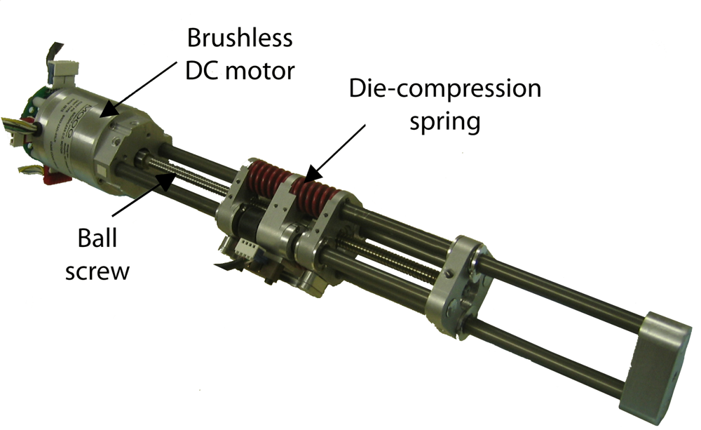 Added to the power requirements described above, the desired elastic behavior of the actuation system can be met by using series elasticity between the motor and the joint. The HADE leg uses Series Elastic Actuators (SEA), a family of actuators specifically designed for the force control of robotic systems. They were designed at the MIT Leg Laboratory and they are currently commercialized by Yobotics Inc. They are backdriveable, compliant actuators with resistance to impact and vibration. The power-to-weight ratio of this actuator in intermittent operation is near 600 W/kg, which fits within the HADE leg requirements. SEAs are low motion, high force-to-weight, high power-to-weight actuators, which employ a novel mechanical design architecture that goes against the common machine design principle of “stiffer is better” [40]. They are composed of a motor and a transmission to the load, but they have an elastic element connected in series between the transmission and the load. Figure 14 shows a photograph of the Yobotics SEA23-23 and Figure 15 shows a simple diagram of a general SEA.