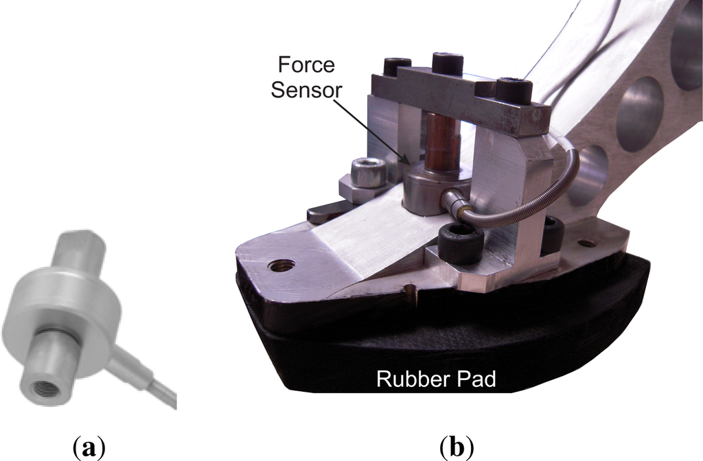 The force sensor at the pad to measure ground-reaction forces is a Honeywell miniature precision load cell model 34 (P/N AL312CR). This sensor is placed inside the pad (see Figure 16) to measure vertical ground forces ranging from 9.8 N to 2200 N. The sensor signal is acquired by a 16-bit A/D converter which provides a resolution of 2.10−13 N. High accuracies of 0.15%–0.25% full scale are achieved. Residual effects of off-axis loads are minimized.