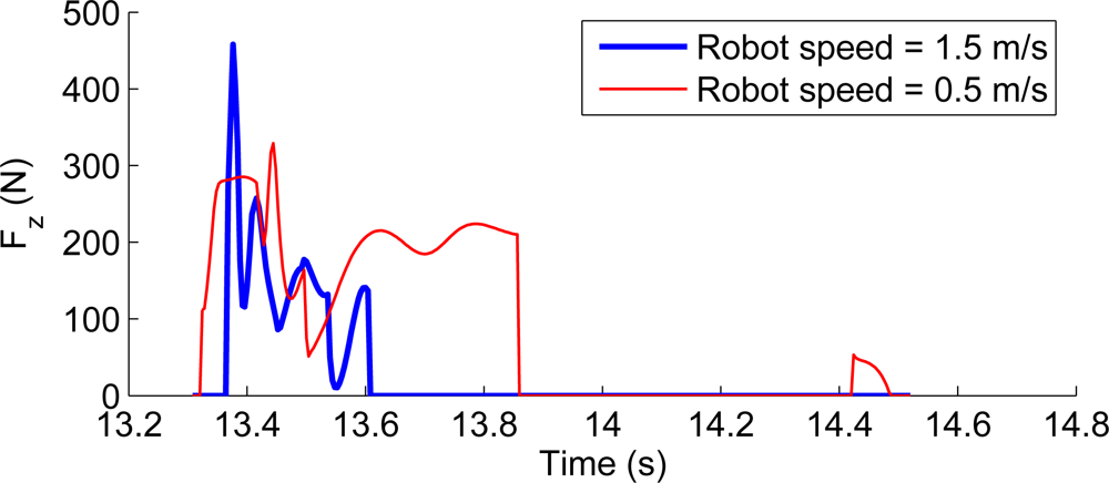 Vertical ground reaction forces are used by the locomotion controller to maintain a desired ground contact force during the stance phase. Figure 17 shows vertical ground forces at the hoof during one locomotion cycle for the leg walking at 0.5 m/s and compares them with the simulated forces for the robot walking at 1.5 m/s assuming a lightweight leg design. The figure shows a sharp impact to the ground at the beginning of the cycle coinciding with the beginning of the stance phase. This impact seems to soften at lower speeds, such as 0.5 m/s although larger loads are involved considering the increase in link weight in the current leg prototype.