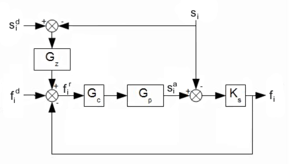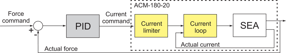 The inner force controller in Figure 18 is based on conventional PID control acting directly on the current command of the SEA’s power amplifier. Figure 20 shows a block diagram of the inner force control scheme.
