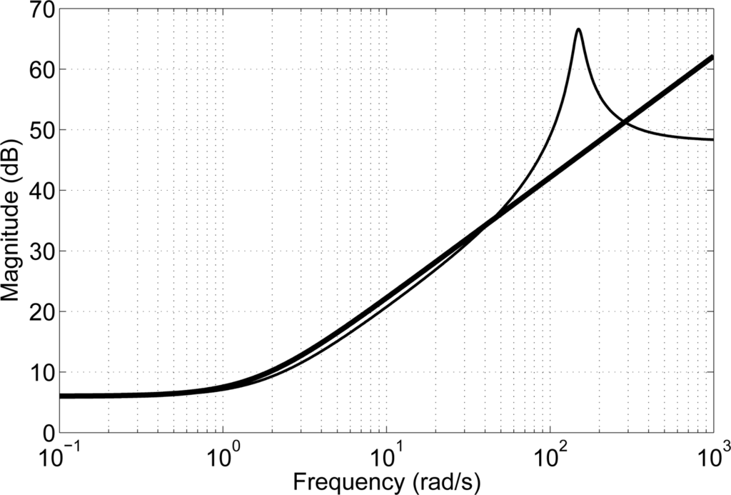 Series elasticity provides good force control at the joints and adds some shock tolerance to the mechanism. Also, it decouples the motor inertia from the load, so that slight position errors will be absorbed by the elastic element, preventing the control system from reacting to unexpected impacts. A compliance controller programmed in the SEA imitates a desired dynamic behavior inside the actuator response bandwidth. As in this case the controlled actuator bandwidth is 35 Hz, then in the range 0–35 Hz the controller allows the actuator to behave like a spring-damper. The block diagram of the compliance control scheme is shown in Figure 18, where Gz is the model corresponding to a spring-damper system, Gc is the transfer function of the inner loop controller, Gp is the actuator’s transfer function, Ks is the die compression spring constant, , fi and are the desired force, exerted force, and the force reference respectively. Finally, , si and are the desired position, the load position and the actuator position. Choosing Gz = K (1 + bs) and by modifying the desired spring-damper coefficients K and b, the mechanical impedance is modified and it can be adapted to different leg velocities and ground stiffness. Figure 19 shows a Bode diagram of the system behavior (thin line) overlapped with an ideal spring damper (thick line) system, which shows that for frequencies below the controlled actuator bandwidth (35 Hz), the controlled actuator behaves like a spring-damper. These properties largely improve the adaptation to the ground in high-speed locomotion.