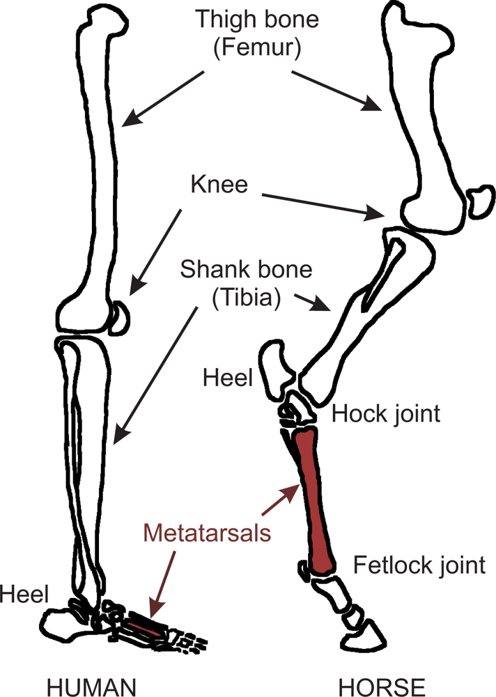 As stated above, a quadruped is considered to perform in agile locomotion when it is able to achieve dimensionless speeds up to 0.54 while carrying a payload at least equal to its own weight. In order to design a leg mechanism able to provide the robot with those features, nature is the best source for inspiration. Horse legs are adapted to provide speed, endurance, agility and strength superior to any other animal of equal size [28]. This adaptation is based on longer legs than similar quadrupeds relative to the body size, which provide longer stride lengths. The length of the horse leg is optimal for running, longer legs would probably be difficult to oscillate (giraffes are not able to trot). The cause for the horse relatively long legs is the evolution of the anatomical foot and toe. Horses feet have undergone extensive modification which have enabled these animals to become powerful runners. The most conspicuous change is the reduction of the number of digits: they have retained only one single functional digit. This digit corresponds to the third toe in humans (see Figure 2) and it is able to withstand forces largely superior to those supported by multi-digit toes. Besides, the metatarsal has been so lengthened that it seems more part of the leg than the foot; human metatarsals are located in the arch as shown in Figure 2. Unlike true leg bones, however, it is not directly powered by muscles. Instead, the metatarsal employs spring-like forces from massive ligaments.