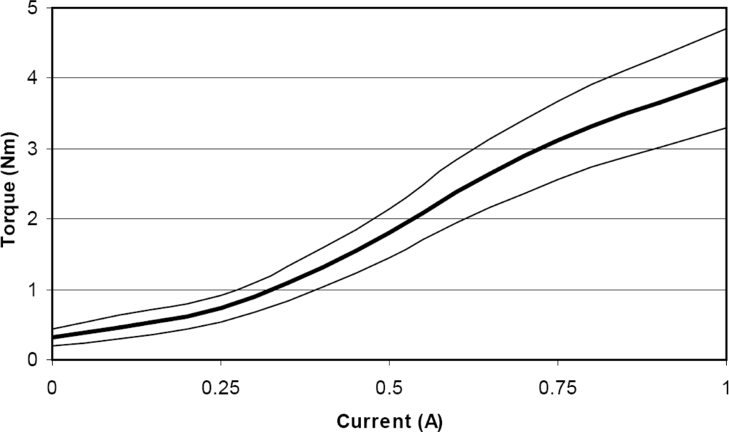 In this project a LORD RD-2087-01 Magneto-Rheological (MR) rotary damper has been placed at the knee to test the efficiency of actively controlling knee damping along the gait cycle (see Figure 21(a)). Magneto-rheological brakes and dampers are resistive actuators based on Magneto-Rheological Fluids, a kind of smart material of the Magnetoactive family [26]. The MR rotary damper is designed as shown in Figure 21(b): An outer housing attached to the thigh contains a rotor joined to the knee axis. The MR fluid fills the space between the rotor and the outer housing. There is a coil attached to the housing, leaving a small space for the MR fluid between the rotor and the coil. As electric current circulates by the coil, a magnetic field is applied to the MR fluid, which yields a significant change in the rheologic characteristics of the MR fluid which is due to the alignment of the ferromagnetic particles of the MR fluid into chains. As a result, an increased shear stress results between rotor and housing, and consequently an increased resistive torque output is achieved in less than 10−2 s response time. The increase of torque that damps the rotor depends directly on the magnetic field applied and increases linearly with rotor speed, thus providing controllable viscous rotary damping. A detailed background on the principle of operation of Magneto-rheological Fluid (MRF) devices can be found in Reference [42]. Figure 12 shows the integration of the MR rotary damper inside the knee of the HADE leg. The maximum power consumption of the MR rotary damper is 1 A at 12 VDC for a maximum resistive torque of 4 Nm. Figure 22 shows the typical torque-current curve for the MR rotary damper provided by the manufacturer.
