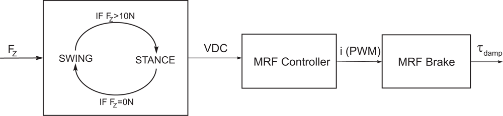 Using the MR rotary damper, the SEAs are used for active motion, while passive damping is performed by the MR rotary damper. The MR rotary damper is commanded through a device controller kit provided by the MRF damper manufacturer. This controller device provides closed loop current control to compensate for changing electrical loads up to the limits of the power supply. The controller device is operated as an interface device for computer control of the MRF damper. When a continuous 0–5 VDC signal is sent to the controller device it commands a proportional pulse-width modulated current signal, where 0% duty cycle matches 0 A and 100% duty cycle matches 1A. A finite-state machine switches between stance and swing states and changes the voltage input to the controller device which in turn modifies the knee damping coefficient. The finite state machine switches from stance to swing when the foot/ground reaction force sensed becomes 0 N and returns to stance state when the ground reaction force reaches 10 N. A block diagram of the MRF control scheme is shown in Figure 23.