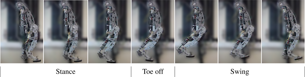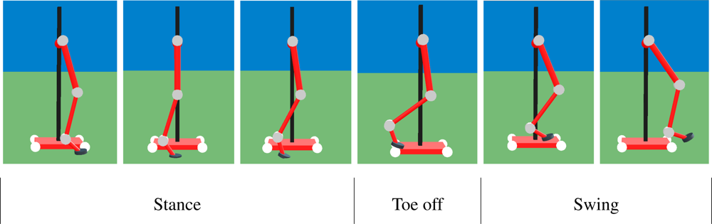 The controller gains have been tuned manually to achieve a natural-looking motion, which are 1.45 Nm rad−1 s during the support phase and 0.9 Nm rad−1 s during the leg swing phase.