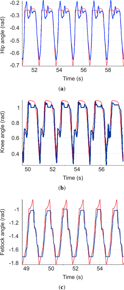 Figure 24 shows snapshots of the locomotion cycle. The video of this experiment can be found at [8]. Figure 25 shows hip, knee and fetlock joint trajectories during six locomotion cycles following the reference trajectories given by the gait controller. The maximum cycle speed achieved in this experiment was 0.6 m/s, with a duration of leg cycle of 1.2 s, half for swing and half for stance phases. These experiments have been performed with the leg running in the air, and the ability of the system to tackle with leg dynamics during agile locomotion has been validated.