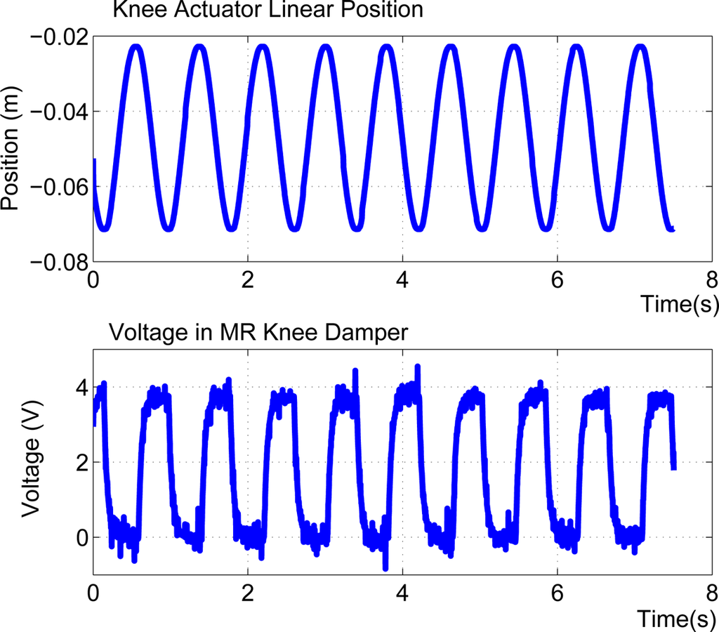 A first experiment has been performed with the leg running on the air. The leg motion is conducted by the locomotion controller detailed in Reference [38], which is based on a state machine that commands the three independent joint controllers, one for each joint, already described in Section 5. The MRF damper controller in Section 5 is used at the knee during swing to damp the shank inertia.