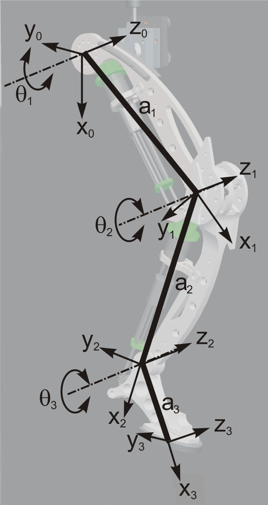 Figure 3 and Table 4 show Denavit–Hartenberg parameters for the leg kinematics, which correspond to a conventional three-link planar structure. Following this convention, the direct kinematic model provides hoof position and orientation from joint angles as follows: