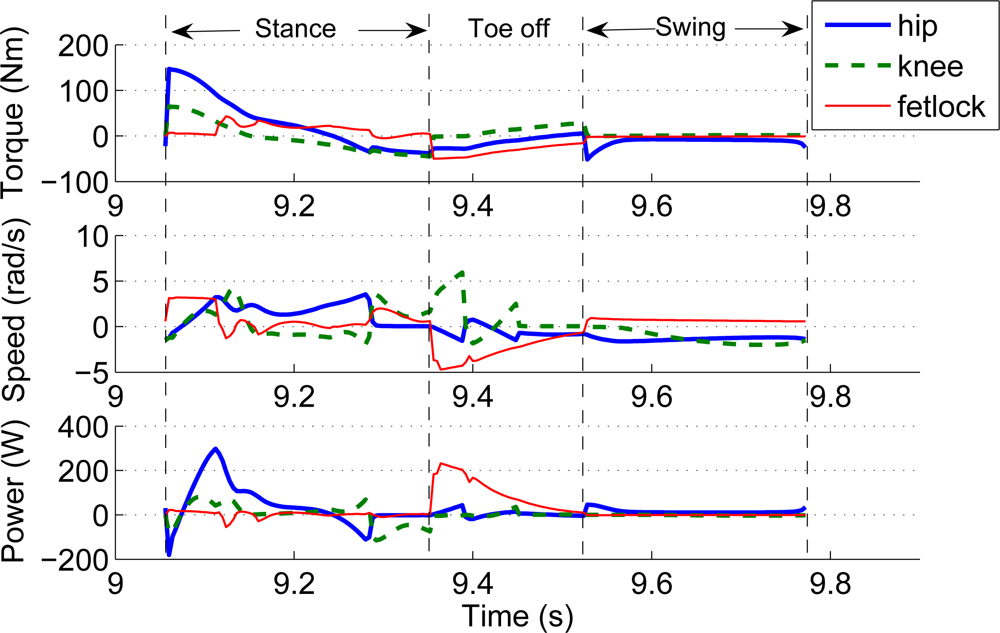 Figure 6 shows a peak demand on hip joint torque near 150 Nm at the beginning of the stance phase. The torque imposed on the hip is mainly used for supporting the robot weight and payload and to propel the robot forward in order to achieve the forward speed of 1.5 m/s. Therefore, the hip accelerates the leg structure, demanding an instantaneous mechanical power of 300 Watts. The knee also contributes to this propulsion, however in a less demanding manner. During toe off, the knee and fetlock do most of the work lifting the hoof. The figure shows large joint speeds required for such motion, as the fetlock has a power requirement of 220 Watts. The swing phase of the leg seems to be the less power-demanding motion.