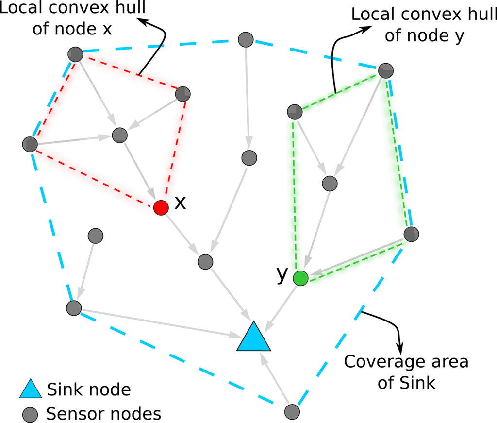 For the distributed construction of convex hulls along the routing tree, each node receives the convex hull information from all its child nodes and merges them together with the addition of the location of the node itself. This procedure constructs a new composite convex hull, which is forwarded further up the tree until it reaches to the sink. The convex hull of the sink covers all the sensor nodes served by this sink as shown in Figure 1 with the blue convex polygon having seven vertices.