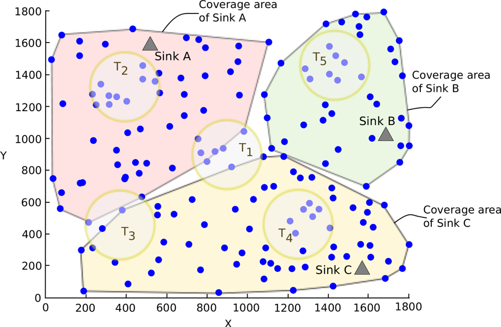 In this section we briefly discuss the design of distributed coverage area construction that is proposed in our previous work [5,6]. Throughout this work, it is assumed that one or more sinks are deployed within the wireless sensor network and each sensor node is logically grouped with only one sink based on a given metric, e.g., shortest path. Basically, the routing strategy of the wireless sensor network determines which node reports to which sink. Before building the coverage areas, the network forms routing trees for each sink based on a given metric. In this work, we consider Voronoi decomposition (explained in Section 2.3) for partitioning of the network between sinks in which the underlying routing metric is the shortest path [4]. In the shortest path routing, a child node selects the neighbor that has the minimum hop count to a sink as the parent node (i.e., the intermediate node) in order to get messages towards the sink. The construction of local coverage areas starts after the routing trees are created.