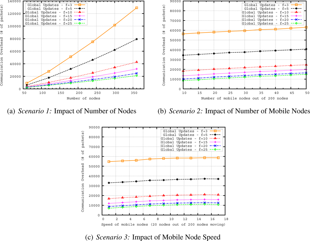 Figure 12(a) presents the results in terms of communication overhead (CO) when we vary the number of nodes. CO values of global updating with f = 10, 15, and 20 are very close to each other. On the other hand, when we increase frequency to 5 and 3, the increase in the communication overhead is very large with increasing number of nodes. The trend in Figure 12(a) is steeper when we increase the number of nodes; on the other hand, in Figure 12(b) and Figure 12(c), the graphs increase gradually. In Figure 12(b), we observe that COs of all frequencies slightly increase. The reason for this behavior is that when we increase the number of mobile nodes, more convex hull update messages are generated due to higher mobility rate. Figure 12(c) shows the CO results with increasing mobility speed. The figure has a very similar shape with the varying number of mobile nodes graph in Figure 12(b). Again, due to adaptation of timeout interval according to the speed of MN, higher speed results in more convex hull update messages in the network.